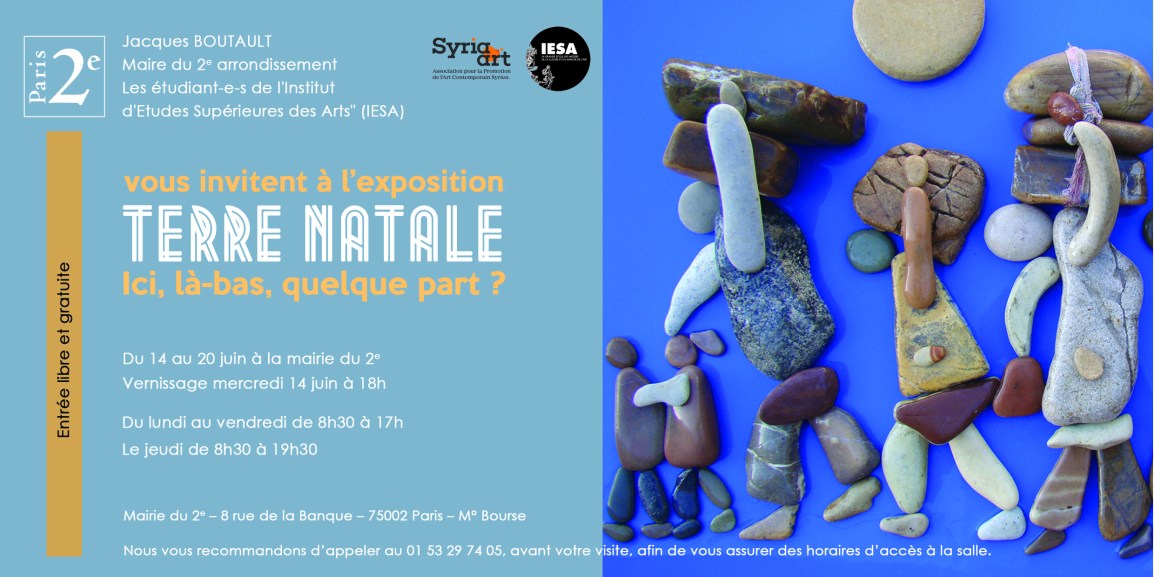 “Terre natale : ici, là-bas, quelque part ?” (Homeland: here, there, somewhere?) is an exhibition organized by four MBA students in Contemporary Art at the Institute for Advanced Studies in Art (IESA) in Paris, in partnership with SYRIA.ART association. The exhibition brings together refugee and exiled artists around the theme of the homeland by allowing them to share their experience.