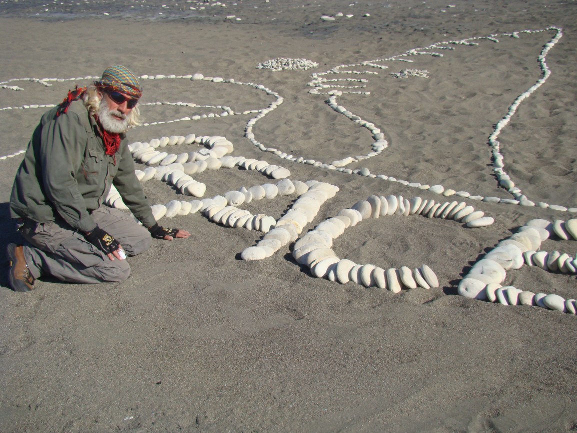 On the Mediterranean coast about 60 kilometers from the city of Latakia in Syria, locals and visitors alike have been accustomed for decades to see a white-bearded man walking between the mountain and the shore. On his back, he always carries a bag of peeble-stones and stops from time to time to sort them out, like a gold-seeker sorting his nuggets. This man is the sculptor Nizar Ali Badr, a gypsy in a world full of disorder, a dreamer in a time of murderous wars. Besides his sculptures, he creates compositions with the Phoenician peeble-stones he gathers on the shores, and starting from almost nothing, he eventually composes simple, touching and astonishing scenes of life.