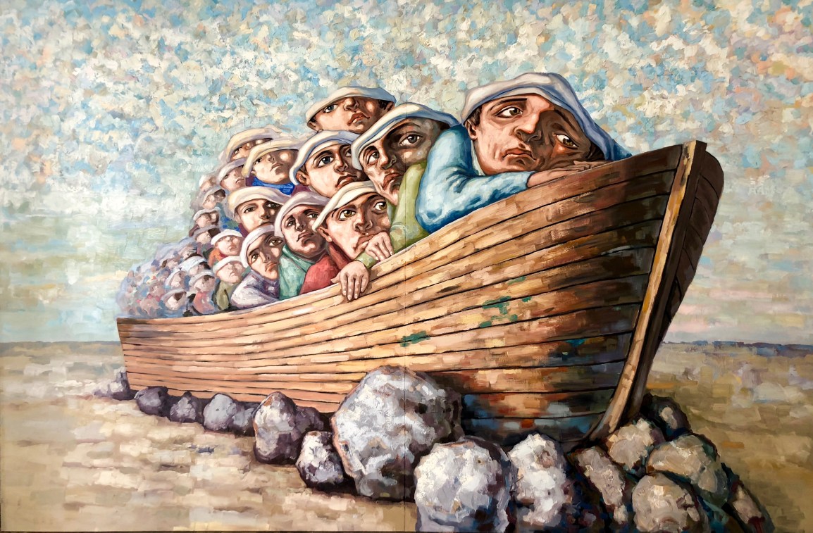 There is a worry in the eyes of those who cross his paintings. But there are also paper boats, like dreams of better days. Even surrounded by his fellows, solitude permeates the work of Al Sayed. Nevertheless, his work is not desperate. In the eyes of his characters remains a glimmer of hope that springs from their eyes.