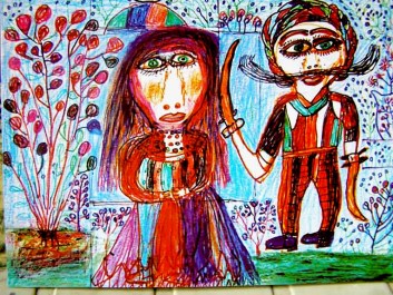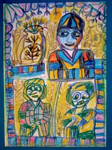 Therefore it is not surprising that her children were born with a creative bent. His son Abdelrahman has become a remarkable Syrian artist. It was he who discovered the artistry of his mother. Then aged 85, between 2000 and 2001, artist Aicha expressed her emotions on paper and canvas, telling about her life experiences, traditions, folk tales, and society. She did not seek fame but simply to express her art and emotions, to share her experience; she made art as a mother who seeks to pass on to her children her knowledge, or tell them stories.