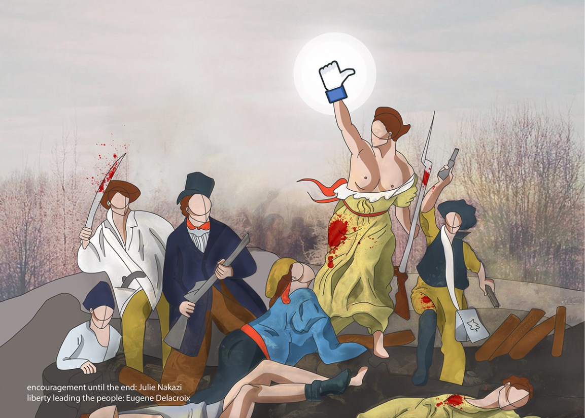 “An artist can not paint a rose while breathing gas” commented Yaser during a radio interview in 2015, hence his will and commitment to recreate the moral structure of Syrian civil society. From his anxiety towards his country and his anger, he does not draw hatred, but a profound reflection on what should be condemned and what should be undertaken to deal with injustice.